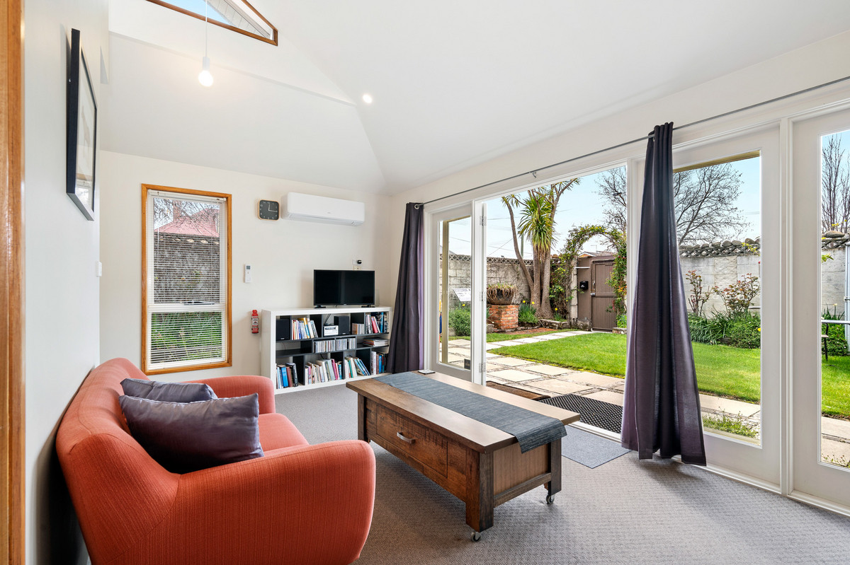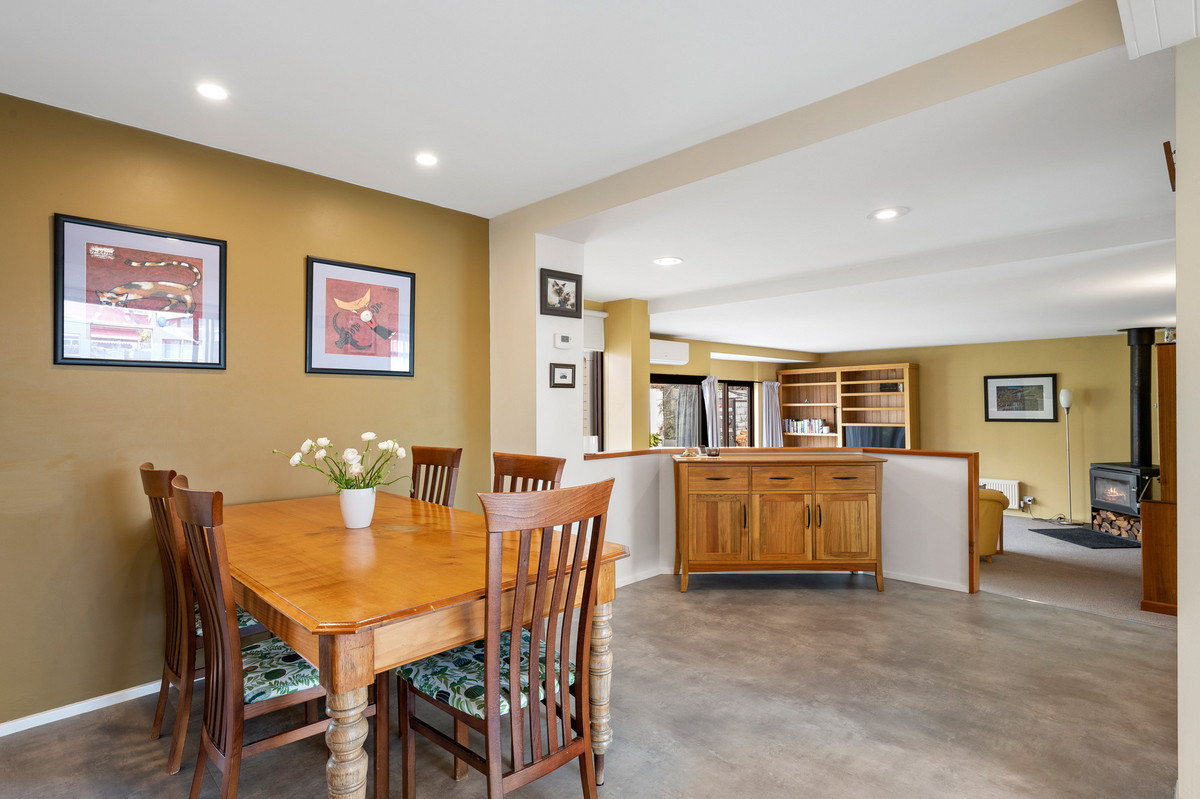 The contemporary addition beyond accommodates the spacious, well-designed kitchen with walk-in pantry and combined laundry facilities adjacent, and the generously proportioned living room with cosy wood fire.