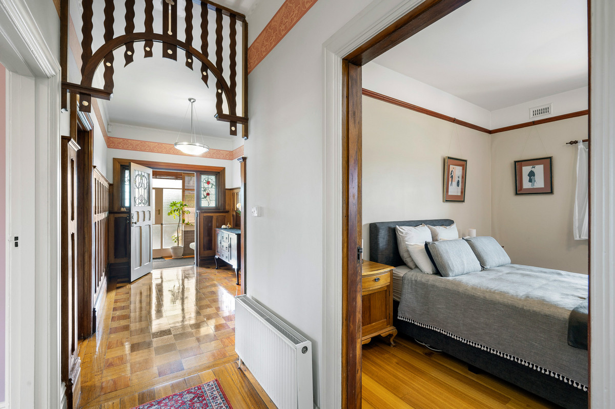 Flexibility in the floorplan delivers a range of accommodation options to suit families of all ages and stages. The entry foyer off the sunroom into the main residence opens onto a wide hallway, with the original 1920s footprint containing the private master suite with walk in wardrobe and ensuite bathroom, three further bedrooms, a sitting room opening onto the verandah, powder room and family bathroom.