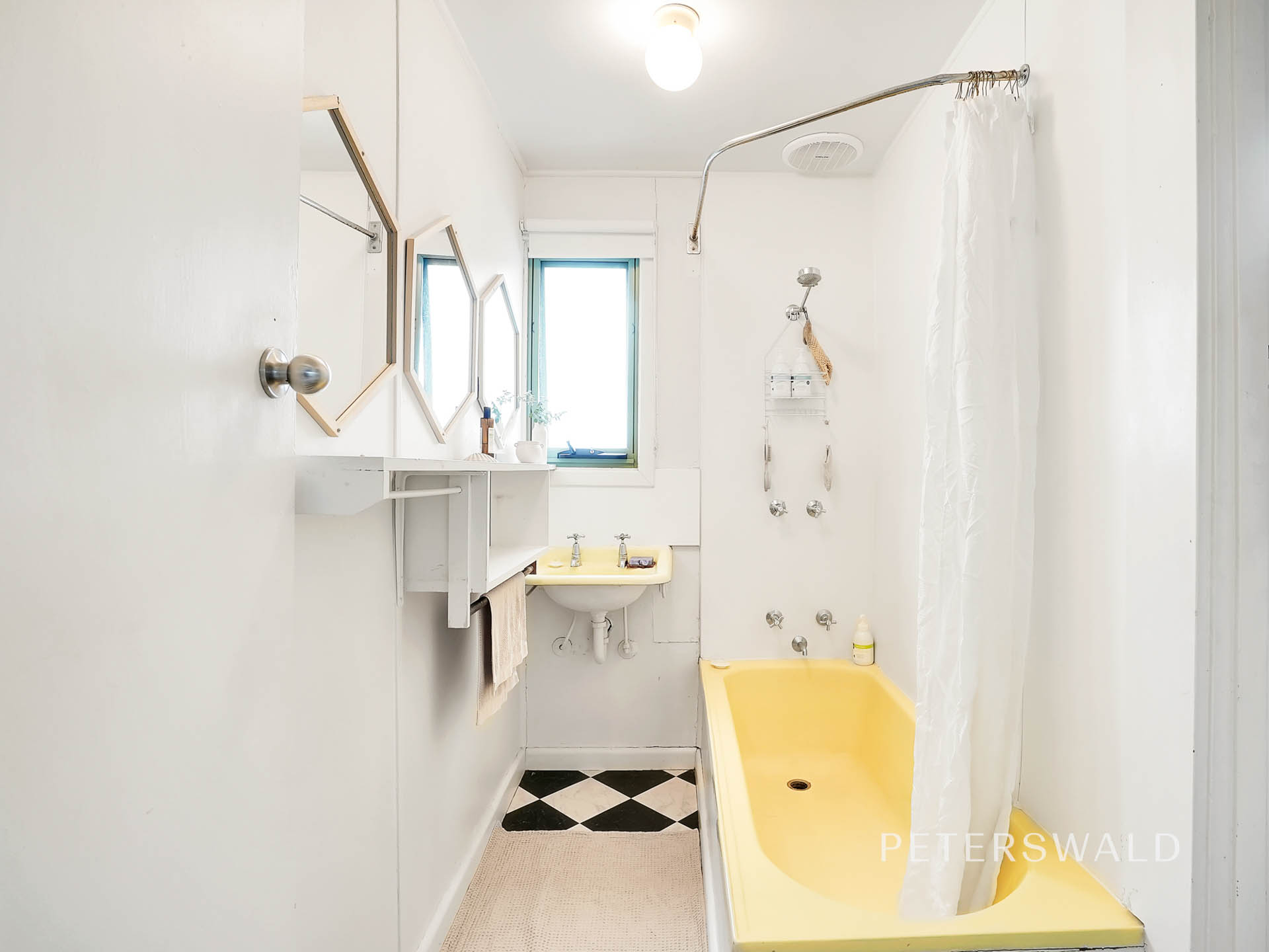 The spacious bedroom includes a built-in wardrobe and desk. The bathroom is designed for convenience, offering a shower over bath, vanity, and toilet, along with ample laundry space.